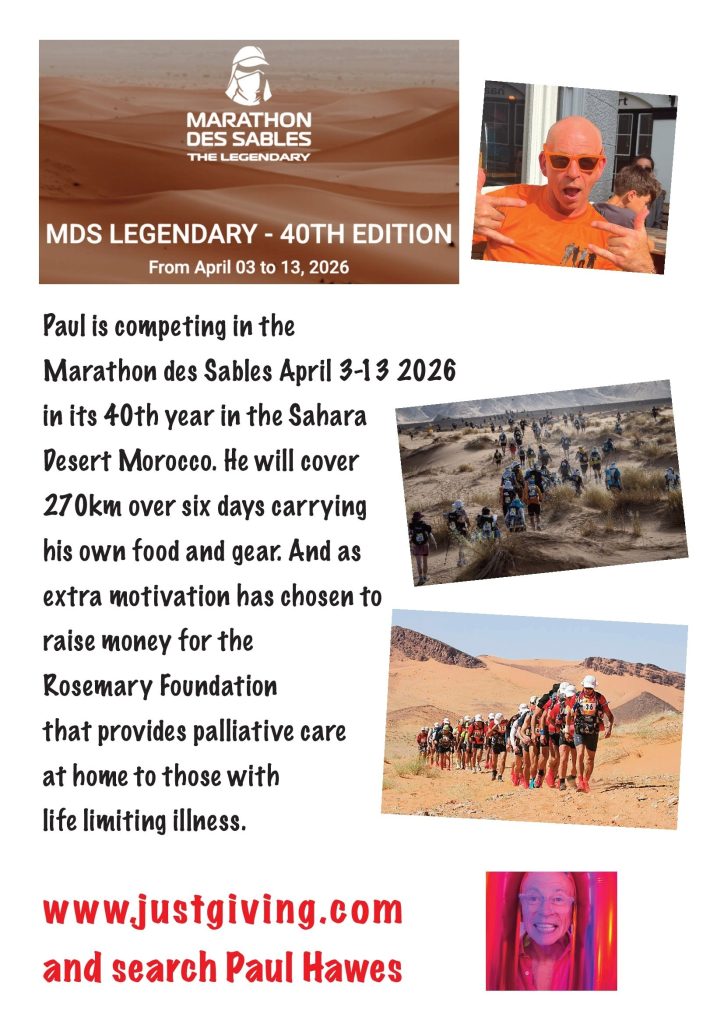 In memory of his father, Paul Hawes is completing the Multi Stage Ultra Marathon in the Sahara Desert, Morocco. This event, in April, is the 40th anniversary and participants will cover a staggering 270KM over 6 days carrying their own food and gear for a week. All money raised is kindly being donated to The Rosemary Foundation.